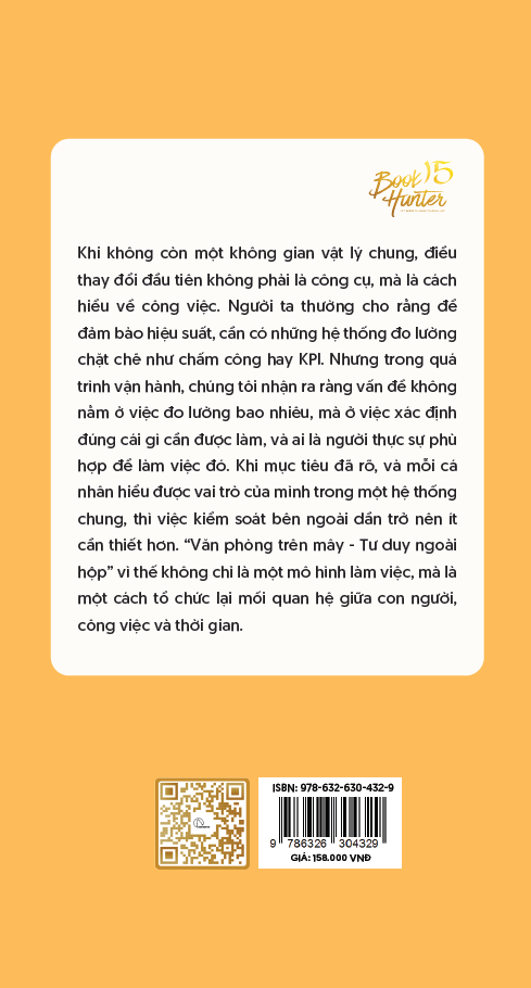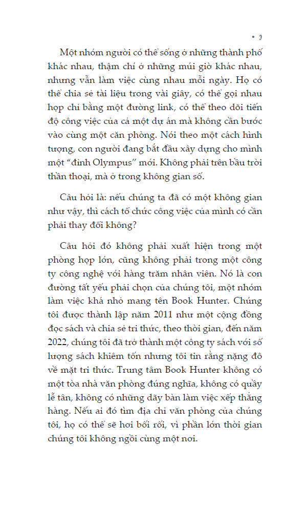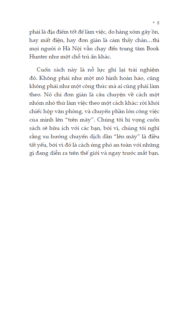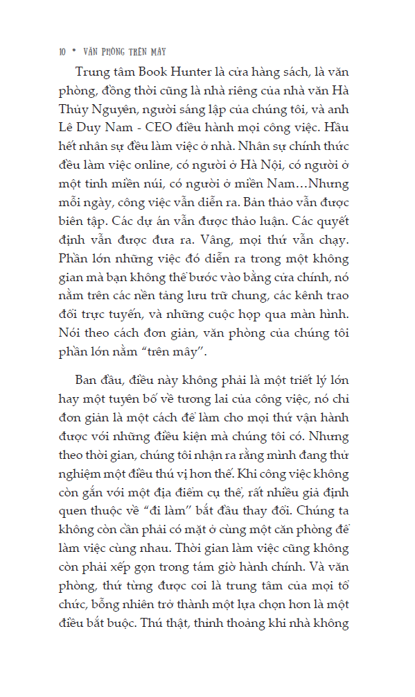 Cuốn sách Văn phòng trên mây – Tư duy ngoài hộp: Vận hành trong thời đại số được hình thành từ câu chuyện thực tế của chúng tôi: hơn 15 năm vận hành gần như hoàn toàn trực tuyến của Book Hunter. Đây không phải là một lựa chọn mang tính xu hướng, mà là một cách thích nghi dần dần với điều kiện nguồn lực hạn chế, buộc chúng tôi phải tìm ra một mô hình tổ chức có thể duy trì được hiệu quả mà không phụ thuộc vào cấu trúc văn phòng truyền thống.